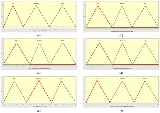 Triangular membership functions for fuzzy system inputs: (a) audio, (b) display window colors, (c) display window light, (d) font of the store name, (e) mannequins, and (f) clothing style.