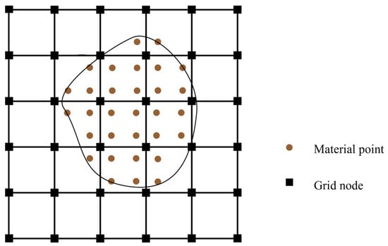 In this paper, all formula notations satisfy the Einstein summation convention, with the subscripts I and p denoting the background grid nodes and material points, respectively. In the classical MPM, a continuous material is described as a series of discrete material points, as shown in Figure 1, and the density of the material can be approximated as follows: