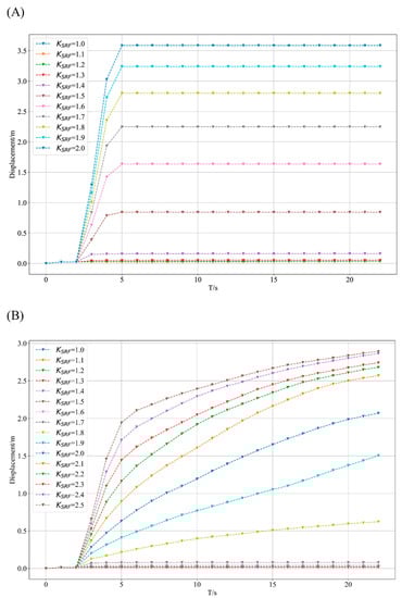 Figure 4. Curves of the maximum displacement of the slope over time for different reduction factors. (A) Maximum displacement variation curve for pure soil slopes; (B) Maximum displacement variation curve for SRM slopes.