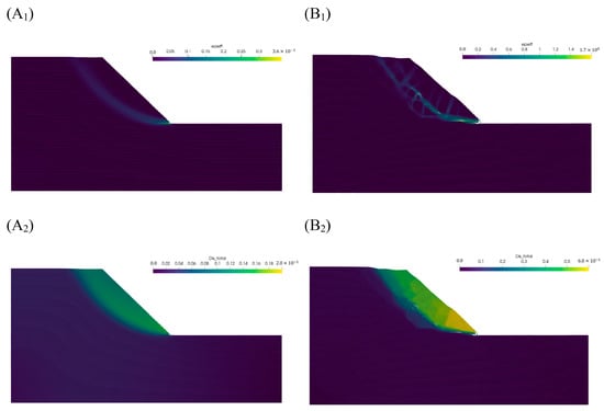 Figure 5. Plastic zone and displacement clouds at slope instability. (A1) Distribution of the plastic zone at the instability of the pure soil slope ( K S R F = 1.4); (A2) Displacement distribution of the pure soil slope at instability ( K S R F = 1.4); (B1) Distribution of plastic zone at SRM slope instability ( K S R F = 1.8); (B2) Displacement distribution of the SRM slope at instability ( K S R F = 1.8).
