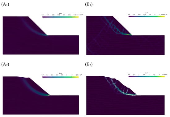 Figure 6. Change of plastic zone of slopes before & after instability. (A1) Distribution of the plastic zone at the instability of the pure soil slope ( K S R F = 1.3); (A2) Distribution of the plastic zone at instability of the pure soil slope ( K S R F = 1.5); (B1) Distribution of plastic zone at the instability of the SRM slope ( K S R F = 1.7); (B2) Distribution of plastic zone at the instability of the SRM slope ( K S R F = 1.9).