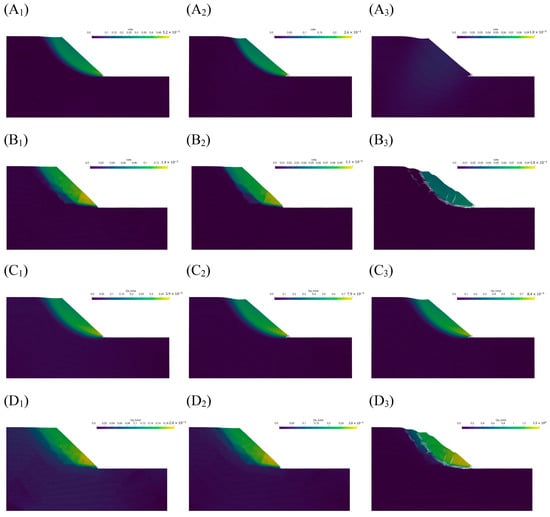 Figure 7. Rate and displacement cloud variation of pure soil slopes and SRM slopes for reduction factors equal to 1.5 and 1.9, respectively. (A1A3) Rate distribution of pure soil slope at t = 3, 4, and 22 s. (B1B3) Rate distribution of SRM slope at t = 3, 4, and 22 s. (C1C3) Displacement distribution of pure soil slope at t = 3, 4, and 22 s. (D1D3) Displacement distribution of SRM slope at t = 3, 4, and 22 s.