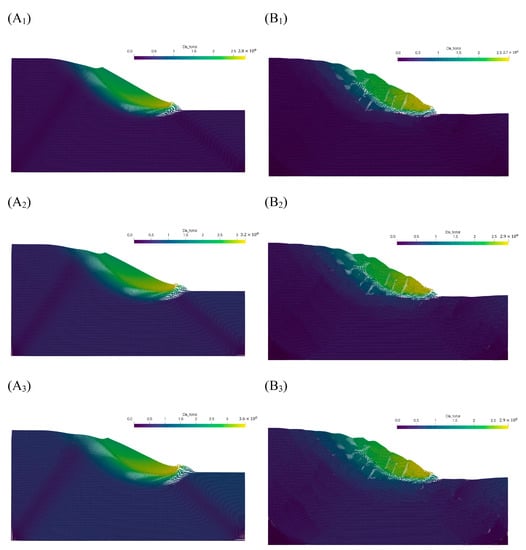 To make the simulation more stable, this paper sets a small-time step, 0.01 ms, in the simulation. The simulation process lasted for 22 s and was divided into two stages. 0~2 s was the first stage, and a stable PIC momentum mapping format [41] and elastic constitutive model were adopted. The gravity is linearly loaded until g = 9.8 m/s2, and then the momentum is set to 0 to obtain the initial state of the slope. 2~22 s is the second stage, using a FLIP momentum mapping scheme with good momentum conservation characteristics [42].