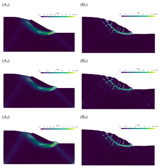 Figure 9. The plastic zone distribution cloud maps of the slopes at extreme conditions. (A1A3) The plastic zone distribution of pure soil slopes at reduction factors equal to 1.8, 1.9, and 2.0, respectively. (B1B3) The plastic zone distribution of SRM slopes at reduction factors equal to 2.3, 2.4, and 2.5, respectively.