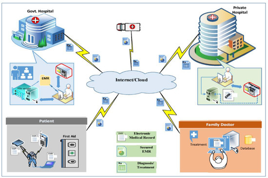 At the base of IoT architectures, Wireless Sensor Networks (WSNs) are situated in which the nodes are resource constrained. Conventionally, they depend on power-scavenging technologies to communicate and function [6]. Therefore, these domains are under continuous research for enhancements concerning the development of compatible components for deployment in resource-constrained environments [7]. It is typical for such systems to have inadequate storage capacity as well as low processing power. These characteristics require befitting communication protocols and network standards for data transmission. Figure 1 illustrates a use case of an IoT-enabled smart healthcare system.