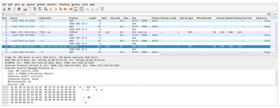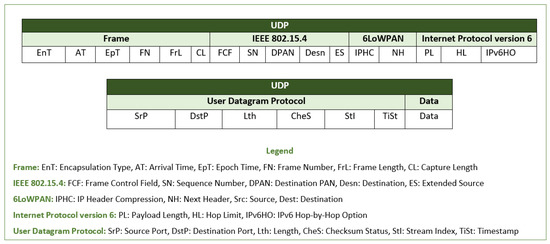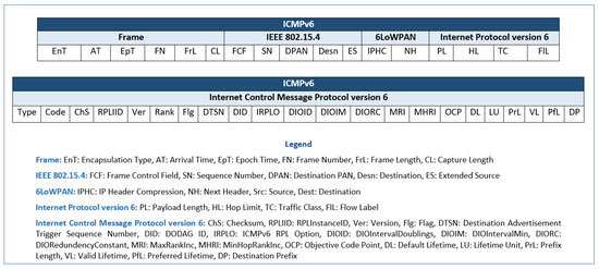 The feature extracting unit manages the extraction of broadly related features from the packets and IoT nodes after fragmentation in the Wireshark. To assure the coverage of all the associated attributes from the network models in RPL-based IoT, the data from each use case is collected, which has contributed towards a novel and diverse LIoTN-RPL dataset. The features are extracted based on the main protocols operating in the network, which are ICMPv6, UDP, and IEEE 802.15.4. The associated features are presented in Figure 4, Figure 5 and Figure 6.