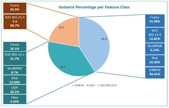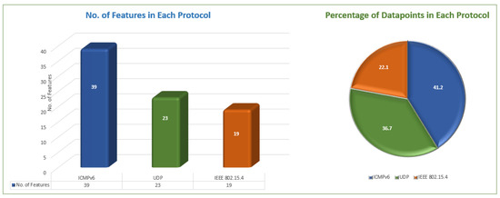 The figures show that “ICMPv6” filter retrieves five primary feature classes with thirty-nine features in total, “UDP” filter retrieves six feature classes with a total of twenty-three features inclusive of the features from other protocols, while “IEEE 802.15.4” has two feature classes with a total of nineteen features. Figure 8 indicates that the percentage of total data points is 41.2, 36.7, and 22.1, respectively.