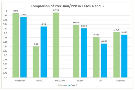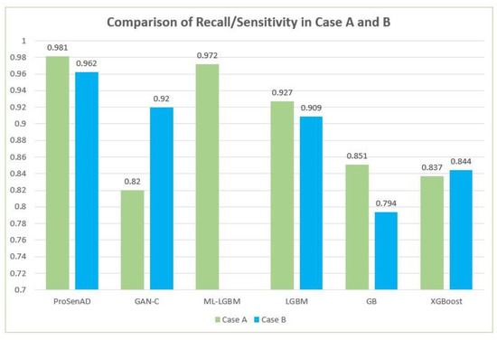 The performance of the proposed ML-based ProSenAD is compared with existing relevant research works [12,13,14] and gradient boosting variants including GB, XGBoost, and LGBM based on the Classification Accuracy (CA), precision/Positive Predictive Values (PPV), recall/sensitivity, CE, CK, and MCC calculation. Multiple network model simulations are performed under two cases and scenarios to obtain the dataset which is split into training and testing set. The testing set environment is used for the performance evaluation. The cases include benign model simulation, PS-R attack simulation, and SN-W attack simulation. The data from the first case is used as a baseline to determine the other two attack cases and the attack-focused results are presented in the next subsections. PS-R attack is identified as Case A and SN-W attack is identified as Case B.