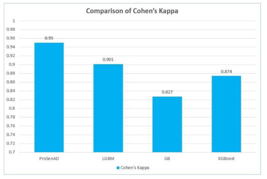Figure 15 shows the performance of ProSenAD in terms of kappa coefficient. The comparison indicates that the proposed model performs better than the benchmarks. GB shows a value of 0.827 in the graphical representation of results which indicates it gaining the poorest results among all methods used for comparison, while LGBM performs better than XGBoost. However, ProSenAD outperforms LGBM with a value of 0.95.