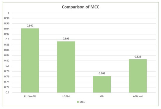 Figure 16 shows the MCC results of ProSenAD, LGBM, GB, and XGBoost, in RPL-based IoT environment for protocol-specific and SN-inherited attack detection. The comparative analysis shows that the proposed model outperforms the approaches used as benchmarks. For instance, the comparison with GB shows the proposed model’s high performance with an 18% improved MCC. XGBoost performs with 0.825 MCC value, as compared to ProSenAD. The latter performs better with 0.942 MCC, indicating an 11.7% increase in the comparative performance. Lastly, the LGBM shows an MCC value of 0.893. ProSenAD exceeds in performance by 4.9% based on this metric when compared to LGBM. Overall, the proposed model outperforms the benchmarks with an average improvement of 11.5% based on MCC evaluation metric.