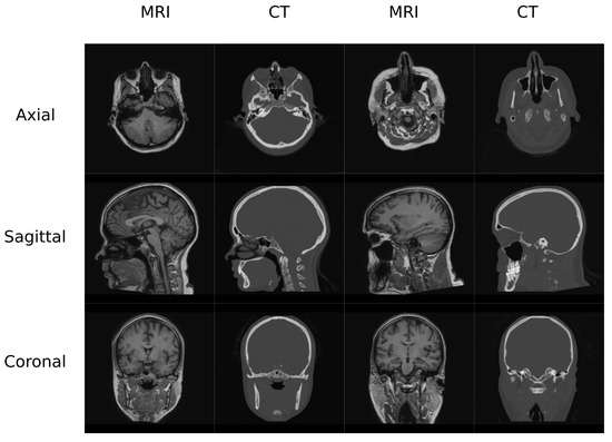 The head database was preprocessed using 3D Slicer built-in modules [32,33]. The preprocessing pipeline included bias correction using the N4 algorithm, rigid registration to align the MR-CT patient pairs as well as to align all the patients in the same orientation, and histogram matching of the grayscale values. Finally, volumes were cropped to slices in the axial direction since it is easier to have a dimension which is a power of 2 in deep learning applications. This occurs due to the network operations, which half and double the spatial dimensions of the input. Figure 1 depicts examples of the volumes in this database.