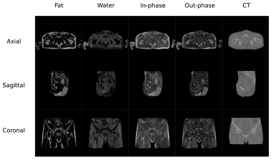 The second database (Figure 2) contained MR and CT images from the pelvis of 13 colorectal and 6 prostate cancer patients (61.42 ± 10.63 y/o, mean BMI 22.3 ± 2.88, 12 males/8 females). Additionally, images from follow-up visits for 9 of the colorectal cancer patients were also included in this study. MR and CT scans were performed on the same day with an average delay of 66 min. CT images were acquired on a Discovery PET/CT 710 scanner (GE Healthcare) with a matrix of , resolution of mm, slice thickness of 3.75 mm, pitch of 0.94 mm, acquisition angle of 0, voltage of 120 kV, and radiation intensity of 150 mA. MR data were acquired on a Biograph mMR scanner (Siemens Healthineers, Erlangen, Germany). The sequence was a dual echo Dixon-VIBE, which is the standard image for attenuation correction purposes. Dixon-Vibe acquisitions are composed by 4 sets of images: water, fat, in-phase and out-of-phase.