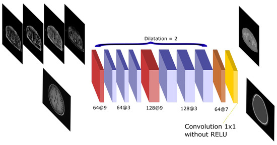The Atrous-Net is inspired by the work by [25]. Dilated convolutions—also called atrous convolutions—are convolutional operations that are performed on non-contiguous voxels instead of being performed on adjacent voxels. The distance between voxels in a convolution is called dilation. Therefore, spatial information can be better preserved each time a filter is applied. This way, the Atrous net performs a succession of convolutions without pooling to avoid the reduction of the spatial resolution of the feature maps. It uses dilated convolutions in order to achieve enough receptive field to compute complex features. Dilated convolutions have been used with quite successful results in other works [34,35]. These convolutions are used as an alternative to the pooling operation to calculate multi-scale features without reducing the shape of the input. In this work, dilation 1 was used for the first and last layer and dilation 2 was implemented for all other layers. After every convolution, a batch normalization and a Rectified Linear Unit (ReLU) as non-linear activation are applied. Figure 3 shows a scheme of the architecture and the number of filters used in every convolution. This network performs 10 convolution operations and has 3.2 and 10.6 million parameters in the 2D and 3D implementations, respectively.