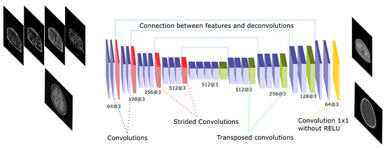 The U-net architecture is a well-known network that has been used in several pseudo-CT synthesis works [21,24,30,31]. The U-net architecture is composed by an encoding step in which several convolutions and pooling operations are applied to extract a hierarchy of increasingly complex and meaningful features. Then, the features are reconstructed in a decoding step using up-sampling operations and convolutions to estimate the final output. In this work, the transposed convolution—also called fractionally strided convolution, was implemented as up-sampling operation. The transposed convolution allows the learning of parameters to perform the up-sampling, and has been previously used for pseudo-CT generation [31]. In this work, the encoding step is formed by 14 convolutions and 4 max-pooling operations. In addition, the filters are doubled after every pooling except the last one due to GPU memory restrictions. In the decoding side, 4 transposed convolutions and 10 convolutions are performed, with filters halved after every transposed convolution. An important part of the U-net is the connection between the encoding and decoding phases, which is known as skip connection. After every max-pooling operation the output is concatenated with the input of the transposed convolution in the decoding side that has the same feature size. These connections allow the decoding step to have information from different scales and feature complexity. After every convolution, a batch normalization and a ReLU activation are performed. The whole network performs 30 convolutions and contains 36.4 and 10.9 million parameters in the 2D and 3D implementations, respectively. Figure 4 depicts a scheme of this architecture.