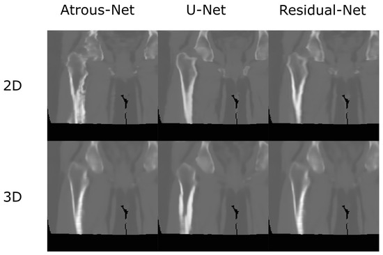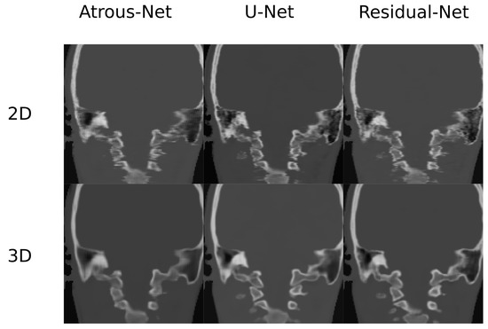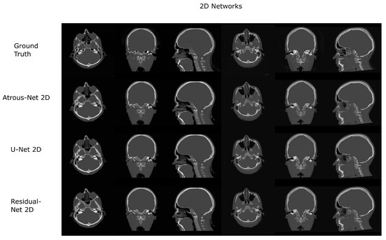 The Atrous-net obtained a MAE of 105.16 HU in head bone and a MAE of 210.51 HU in pelvis bone. In the head dataset, this result was 18% worse than the best result. In pelvis, it was around 5% worse. The Atrous-net showed not statistically significant differences in pelvis between 2D and 3D MAE (all tissues: , ; bone: , ) and PSNR (all tissues: , ; bone: , ). However, for the head data set there were statistically significant differences in bone depiction between 2D and 3D MAE (all tissues: , , bone: , ) and PSNR (all tissues: , ; bone: , ).