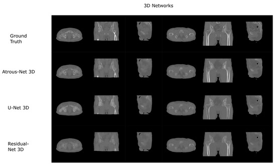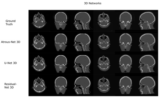 The results for all tissues using the head dataset are depicted in Table 1, Table 2 and Table 3; the results using only the bone voxels are detailed in Table 4, Table 5 and Table 6; the results using only the fat voxels are detailed in Table 7, Table 8 and Table 9; and the results using only the soft-tissue voxels are detailed in Table 10, Table 11 and Table 12. The best performing 2D network for the head dataset was the Residual-net. The results presented a MAE of 99.83 HU, a PSNR of 24.83 and a Pearson Coefficient of 0.931 in all tissues, and a MAE of 326.33 HU, a PSNR of 19.04 and a Pearson Coefficient of 0.826 in bone voxels. The ANOVA test revealed a statistically significant effect of the 2D architectures for MAE results (all tissues: , ; bone: , ) and PSNR results (all tissues: = 99.3, ; bone: = 85.6, ). A paired t-test was used to compare the Residual-net to the other networks reporting also statistically significant differences in the MAE and in the PSNR (Table 13). Using 2D convolutions, the Atrous-net and the U-net performed 5% and 18% worse than the residual-net, respectively. Moreover, the U-net network was clearly behind the other networks using 2D convolutions. Nevertheless, the U-net in 3D-16 obtained a MAE of 89.54 HU, a PSNR of 25.69 and a Pearson Coefficient of 0.943 in all tissues, and a MAE of 289.10 HU, a PSNR of 20.05 and a Pearson Coefficient of 0.861 in bone voxels, which were the best results for the head dataset. The ANOVA test also reported a statistically significant effect of the 3D networks for the MAE (all tissues: ; bone , ) and the PSNR (all tissues: , ; bone: , ). The post hoc paired t-test that is depicted in Table 14 also reported statistically significant differences in the MAE and PSNR after comparing each architecture. Summarizing, the results using 3D convolutions from the U-net were 17% and 10% better than those of the Atrous-net and Residual-net, respectively. Visual result examples of head pseudo-CTs are depicted in Figure 6 and Figure 7. Table 15 shows the time needed to synthesize a whole head volume using the different architectures.