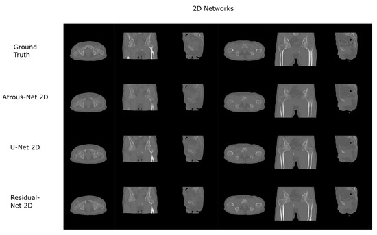 In case the anatomy does not have complex structures across slices, 3D schemes are not the best option. Moreover, if the input image has very similar areas -as in pelvis acquisitions-, 3D patches will not satisfactory synthesize the pseudo-CT due to the lack of contextual information. In this scenario, according to our results, it would be better to use a 2D scheme. Specifically, the residual network obtained the best results in 2D (), which is consistent with the results in general computer vision, where 2D approaches are used [26,39].