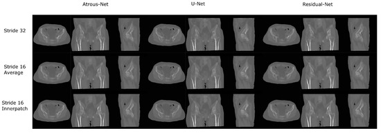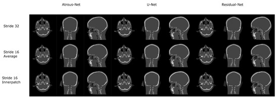 Figure 10 and Figure 11 show the results of the three merging strategies that have been tested: stride 32, stride 16 with averaging of overlapping voxels and stride 16 considering the inner cube. The average time to synthesize a volume is shown in Table 15 and Table 30. The first method—referred as “stride 32” in Figure 10 and Figure 11—generated artifacts in the boundaries of the cube and misalignment in the bone and air structures. Moreover, this approach showed a greater error than the other two in the quantitative results. Nevertheless, this method was quite fast, generating a volume in 8–19 s. The other two methods provided, in average, a similar quantitative result, being the use of the inner cube slightly better. However, the use of stride 16 increased the time to generate a pseudo-CT volume up to 58–90 s. According to the averaging strategy, some artifacts can be noticed in the boundaries of the cubes after a visual inspection of the results.
