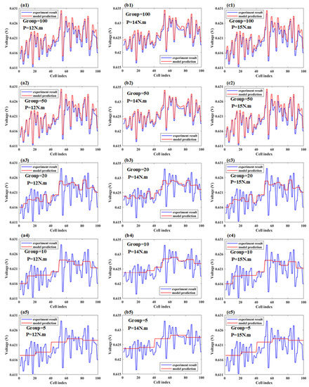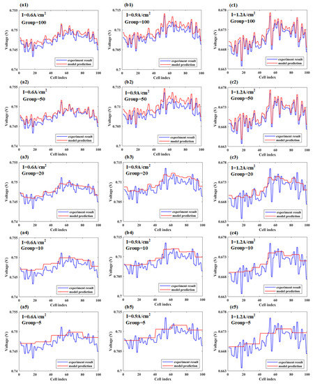 - The ANN model can accurately predict each group’s average voltage under different group strategies. The MSE values of the proposed models are lower than 8 × 10−7. With the reduced output dimension of the model, details of the individual cell voltages are missed, but the distribution trends of the cell voltage distributions are retained.