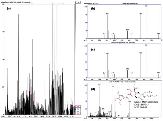 The (a) chromatogram, (b) scan, (c) extracted and (d) suggested target methoserpidine (CAS number: 865043) mass spectra derived from one of the three samples.