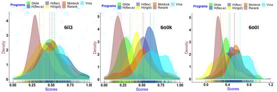 The distribution of the normalized docking scores of all of the molecules across the seven docking scores, showing the level of overlap and mean value (dash line).