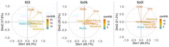 The distribution of the individual seven docking scores along with the two principal components with the quality of the contribution (cos2) of each to the PCA computed from the multivariance analysis to show their level of correlation. When the docking scores appear within close range to each other and are of a similar contribution to the PCA (similar color), then it shows a good level of correlation.