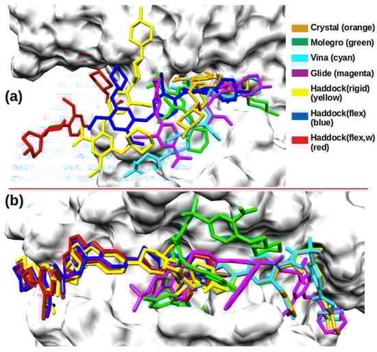 The binding site orientation of (a) gilteritinib to FLAT3 and (b) venetoclax to BCL-2 obtained from Molegro (green), Vina (cyan), Glide (magenta), Haddock(rigid) (yellow), Haddock(flex) (blue), and Haddock(flex, water) (red), in relation to their crystal structure crystal (orange).