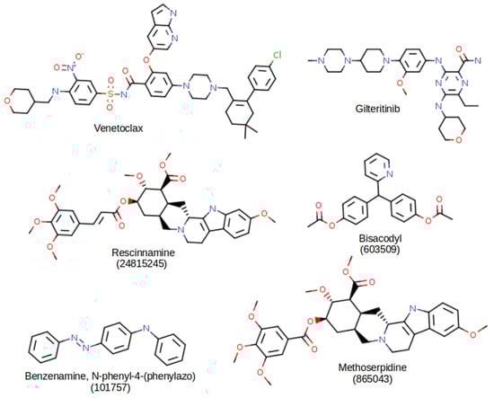 Methoserpidine and rescinnamine, which were found to be potential inhibitors of BCL-2 and FLAT3, respectively, were also predicted to be the top two promising inhibitors of the mutated BCL-2 G101V.