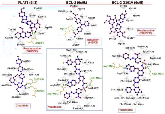 The docking pose binding site interaction of the rescinnamine (24815245) with FLAT 3 (6il3) and the mutated BCL-2 G101V (6o0l) and the interaction of bisacodyl (603509) with BCL-2 (6o0k), comparing the residue interaction with that of the crystal structure of the gilteritinib interaction with FLAT3 and the venetoclax interaction with BCL-2 and the mutated BCL-2 G101V.