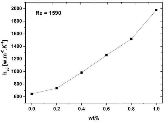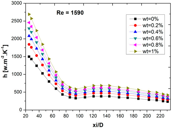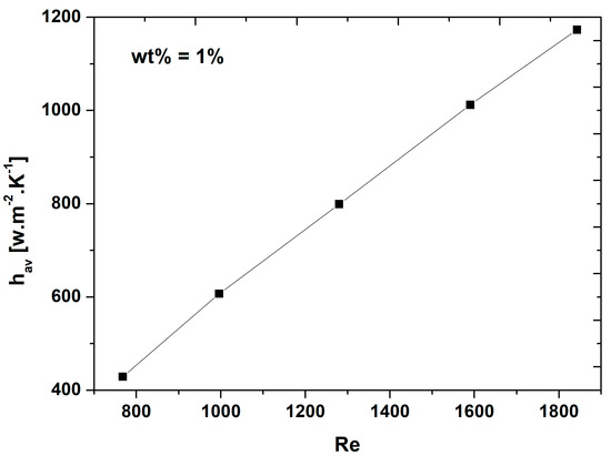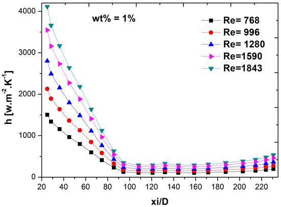 - Increase in the Reynolds number is accompanied by a significant increase in heat transfer coefficient which reaches its maximum of 1173 W·m−2·K−1 for wt% = 1% and Re = 1843.