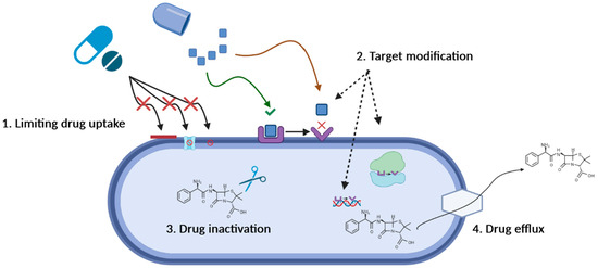 Depending on where in the bacterial cell the antimicrobial exerts its effect, for most antibiotics, the drug needs to be taken up by the bacteria as an initial step. However, this process can be hindered intrinsically, as is the case with certain Gram-negative lipidic cell membranes that constitutively do not allow the diffusion of hydrophilic drugs [10] or by acquiring a thickened cell wall in Gram-positive bacteria [9].