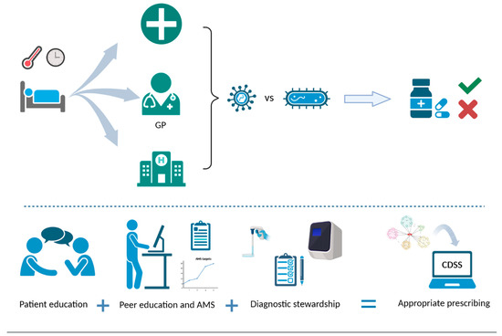 Numerous opportunities exist for targeted intervention to reduce avoidable antibiotic use. We illustrate such opportunities for intervention throughout the continuum of care, at patient level, pharmacy level and healthcare level in Figure 2. Specifically, when a patient presents fever, he or she can go to the pharmacy, to the general practitioner or to the hospital. In each of these settings, a differential diagnosis will be considered, whether the fever is due to a viral or a bacterial infection and the resulting decision will lead to an appropriate or an inappropriate prescription (Figure 2—upper panel). At each of these steps, there is room for improvement (Figure 2—lower panel) and by integrating patient education, peer education and implementation of AMS and diagnostic stewardship, appropriate prescribing can be facilitated. These different interventions are described in more detail below.