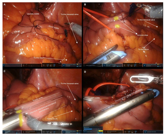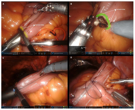 - A 1.5 cm perpendicular incision of the intestinal tract is made at the level of the lateral left horn, in order to permit the introduction of the 60 mm mechanical stapler (SureForm®, Intuitive Surgical, Sunnyvale, CA, USA) and perform the detubularization of the lateral left horn, similarly as done before for the right horn (Figure 2B,C).