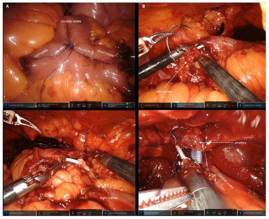 Figure 3. (A) Final shape of the neobladder prior to the ureteral and urethral anastomosis. (B) Anastomosis of the right ureter in the right horn. (C) Anastomosis of the left ureter in the left horn. (D) Anastomosis of the caudal horn to the urethra.