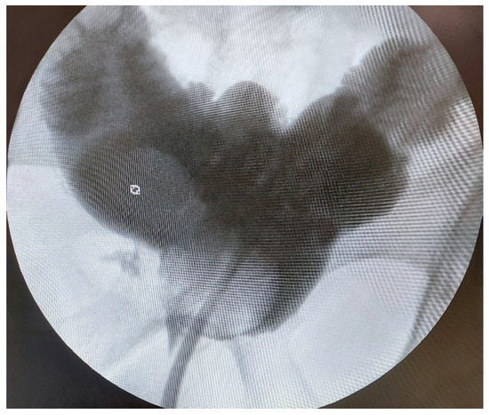 The nasogastric tube was removed the day after the surgery, contextually to the feeding and mobilization of the patient. The abdominal drain was removed the second day after the surgery and patients were discharged 10 days after the surgery. A retrograde cystography was performed before discharge and on day 20 after surgery, prior to the removal of the urethral catheter if no urine leakage occurred (Figure 4). Bladder volume was evaluated by ultrasonography three months after the surgery. Day and night-time continence were defined as no pad use.