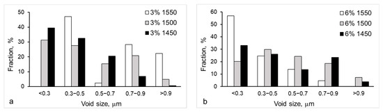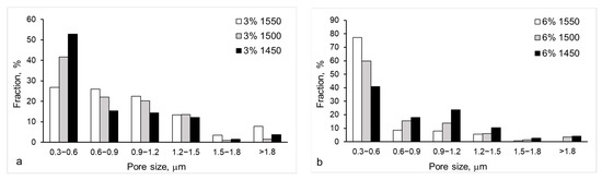A quite different pattern of the porosity evolution was revealed for the material with a higher content of yttria (Figure 2b). With a decrease in the sintering temperature of the 6YSZ ceramic from 1550 to 1450 °C (Figure 2b), the fraction of 0.3–0.6 μm pores decreased from 76 to 40%. At the same time, the fraction of 0.6–0.9 μm pores increased from 9 to 15%, this of 0.9–1.2 μm pores increased from 7 to 22%, and this of 1.2–1.5 μm pores increased from 5 to 10% (Figure 2b). Similarly to a trend for the 3YSZ ceramic, negligible fractions were determined for all the sintering temperatures for 1.5–1.8 μm and >1.8 μm pores.