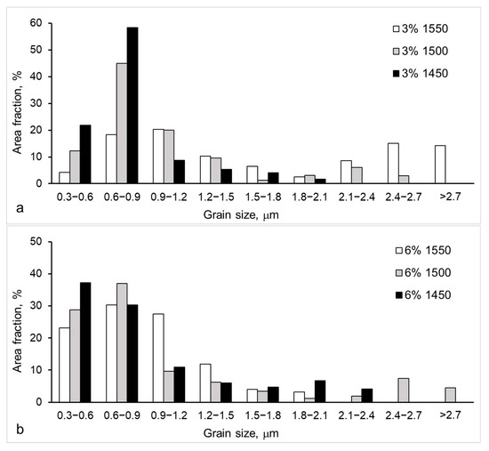- With a decrease in sintering temperature from 1550 to 1450 °C, for the 6YSZ ceramic, the area fraction of 0.3–0.6 μm grains (the smallest grains, Figure 4b) increased from 24 to 37%; this material exhibited finer microstructure compared to other conditions; for 6YSZ ceramics sintered at 1500 °C and 1450 °C, increased area fractions were revealed for larger grains, >2.4 μm and >1.5 μm grain sizes, respectively;