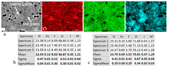 Chemical analysis of the 6YSZ ceramic sintered at 1500 °C: (a) SEM-BSE image and EDS maps of O, Y, and Zr with chemical compositions measured for (b) coarse and (c) fine grains.
