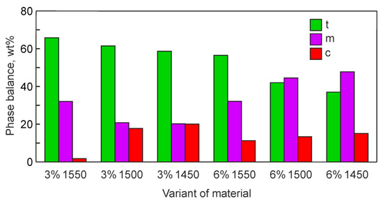 Using XRD patterns for the studied ceramics presented in our previous research [39,40], we constructed the dependences of phase fractions on the sintering mode (Figure 6). As mentioned above, three phases (m, t, and c-ZrO2) are present in these materials in various ratios.