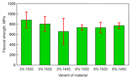 A testing machine MTS E43.004 (MTS Systems Corporation, Eden Prairie, USA) with a unit for three-point bend loading was used for performing the bend test of the beam samples at 20 °C in air. The loading unit was set with 14 mm distance between the supporting rollers. The material strength in flexure was calculated using the equation [45]: