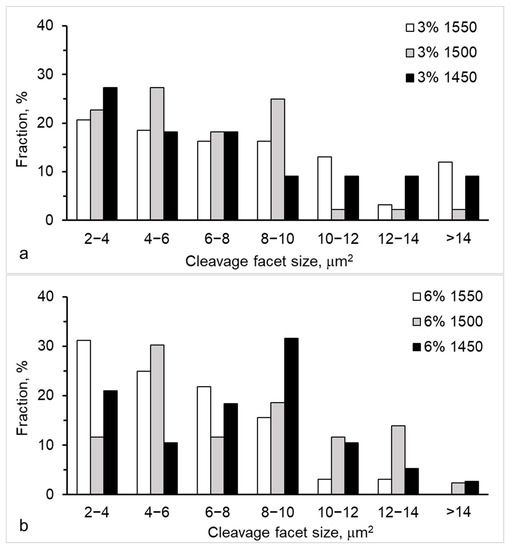 A gradual decrease in fractions of cleavage facets (from 31.5% to 16%) with increasing the cleavage facet size (from 2–4 µm2 to 8–10 µm2) was revealed for the 6YSZ ceramic sintered at 1550 °C (Figure 10b). Moreover, a very small percentage (less than 6%) was found for larger cleavage facets. In the cases of sintering temperatures of 1450 °C and 1500 °C, the total fraction of large cleavage facets of 10–12 µm2 and >14 µm2 was much higher (from 20% to about 29%).