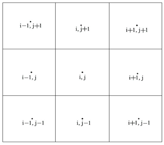 The computational grid developed by [36] can be extended, in the case of the 2D dam-break problem, by labeling the interior cells with i = 1, 2, …, M and j = 1, 2, …N (Figure 1). The grid considers two ghost cells at all sides: for i = −1, 0 and i = M + 1 and j = −1, 0 and j = N + 1; the computation made in the ghost cell should also be based on data from the interior cells, namely: