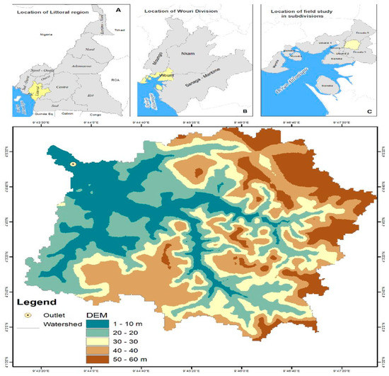 Location of the Tongo Bassa watershed in Cameroon: (A) (Location of Littoral Region on the Cameroon map), (B) (Location of Wouri Division on the Littoral Region), (C) (Location of Field study in subdivisons of Wouri) and Tongo Bassa Watershed.