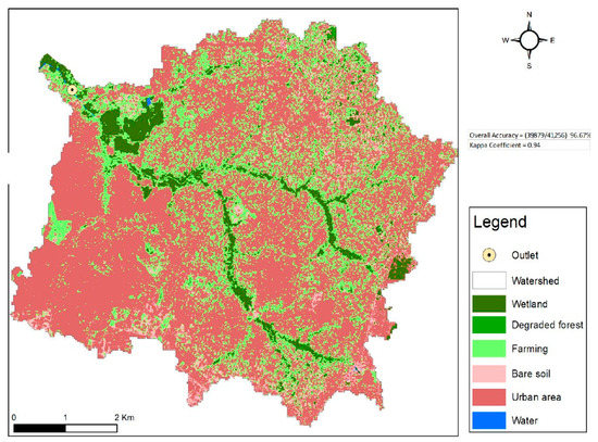 The watershed is composed of valleys where the altitudes vary from about 5 to 60 m above sea level, on average. This area is dominated by two main seasons: dry (December to February) and wet (March to November). However, it should be noted that these seasons do not affect the monthly temperatures. Particularly in August, the temperature is 26 °C and reaches 28.6 °C in February, with an annual temperature average estimated at 27 °C [45]. They found that the lowest amount of precipitation is recorded in December (the monthly average is 35 mm) and the maximum is recorded in July and August (an average of 754 mm). The land cover of the watershed is occupied by vegetated soil at 6.43% (267.61 ha), bare soil at 5.03% (209.17 ha), farming at 26.23% (1091.46 ha), urban areas at 62.25% (2590.44 ha) and water at 0.07% (2.92 ha) (Figure 3).