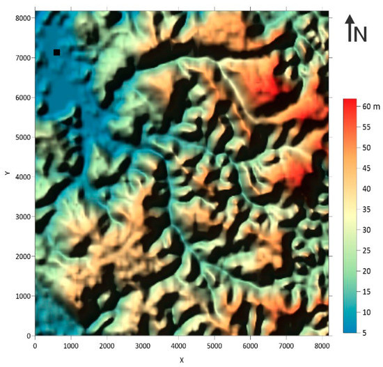 In this study, a digital elevation model (DEM) mapping 30 m from the study area was uploaded from the website (https://search.earthdata.nasa.gov/search accessed 21 June 2022) and processed using the ArcGIS software. This procedure highlighted the watershed, in addition to identifying the outlet and its coordinates; next, we imported “the whole catchment” which was previously delimited in the ArcGIS software, and the DEM uploaded using “global mapper software” for the next processing stage. The output file was created in the “xyz format”, following this final processing of the map using a global mapper with a mesh of 20 m along the x and y directions. The coordinates were output in the UTM projection and the surface was projected in a Cartesian reference frame, with a 20-meter gap in the x and y directions. The results are shown in the Figure 4, as follows.