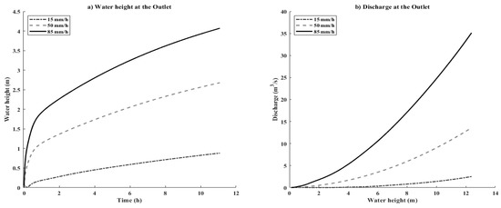 Water height propagation at different time steps for a constant rainfall intensity (15 mm/h).