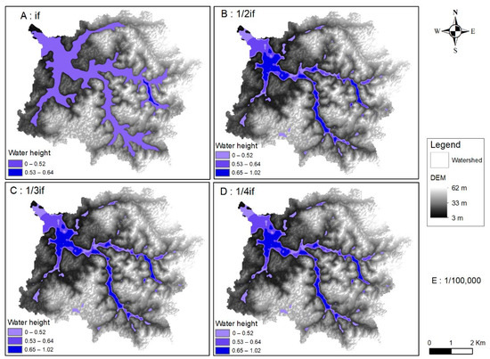 The same simulation has been repeated, taking 85 mm/h as the rainfall intensity, and the results are illustrated in Figure 6. The distribution of water over the watershed appears greater than in case study 1 (at 15 mm/h). The floodable surface is more significant and covers the urge space of the watershed. The water heights in the lowest points (watercourse) reach a maximum value of 4 m after 11 h of simulation.