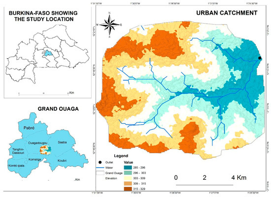 - Gnenakantanhan, C.; Babacar, L.; Fowe, T.; Adjadi, M.L.; Harouna, K. Urban Flood Modeling Using 2D Shallow-Water Equations in Ouagadougou, Burkina Faso. Water 2020, 12, 2120. [Google Scholar] [CrossRef]