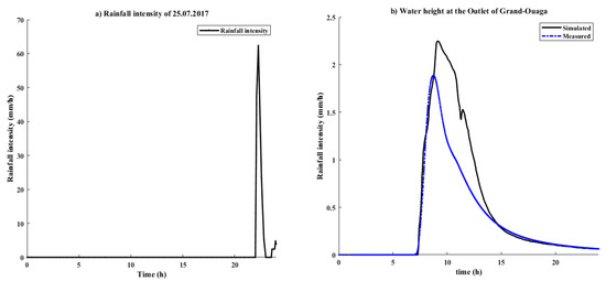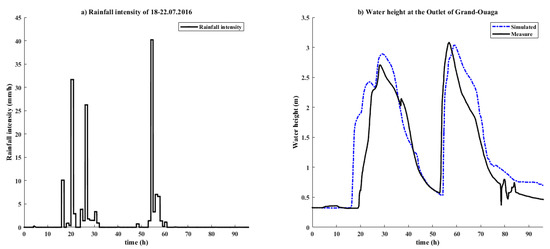 Figure 5 shows the water height propagation in the Tongo-Bassa watershed for rainfall intensity of 15 mm/h. After 15 h, a surge in the water converges toward the watercourse located in low-altitude or valley-bottom areas, which eventually comes out of its minor bed; the water height reaches 1.2 m in the deeper section.
