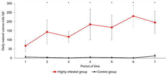 Daily varroa mite fall in highly infested and control hives over time. Average data (+/−SD) over determined periods for each group are shown in the figure. Daily varroa mite fall was significantly higher in infested hives compared to control hives for most periods (*, p < 0.0001, post hoc Tukey test in LMM) except for the first period (p = 1.00, post hoc Tukey test in LMM).